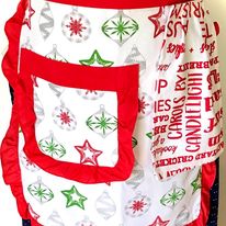 Christmas Apron with a removable hand towel and large pocket in a Christmas Baubles print with red or green frills.