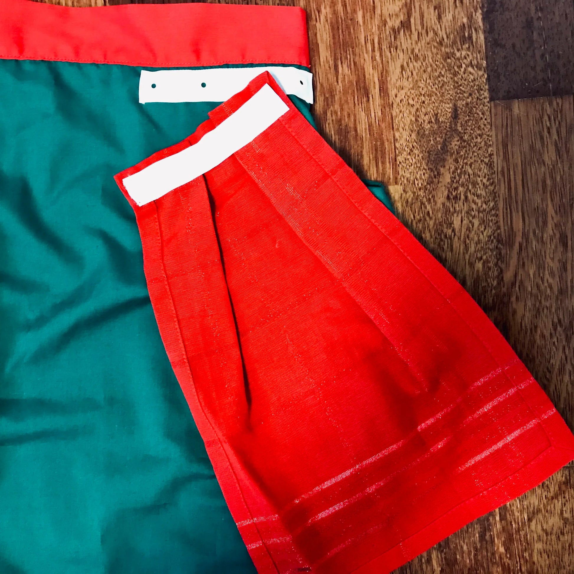 Christmas Apron with a removable hand towel and large pocket in green with a Poinsettia print pocket and a red glittery hand towel.