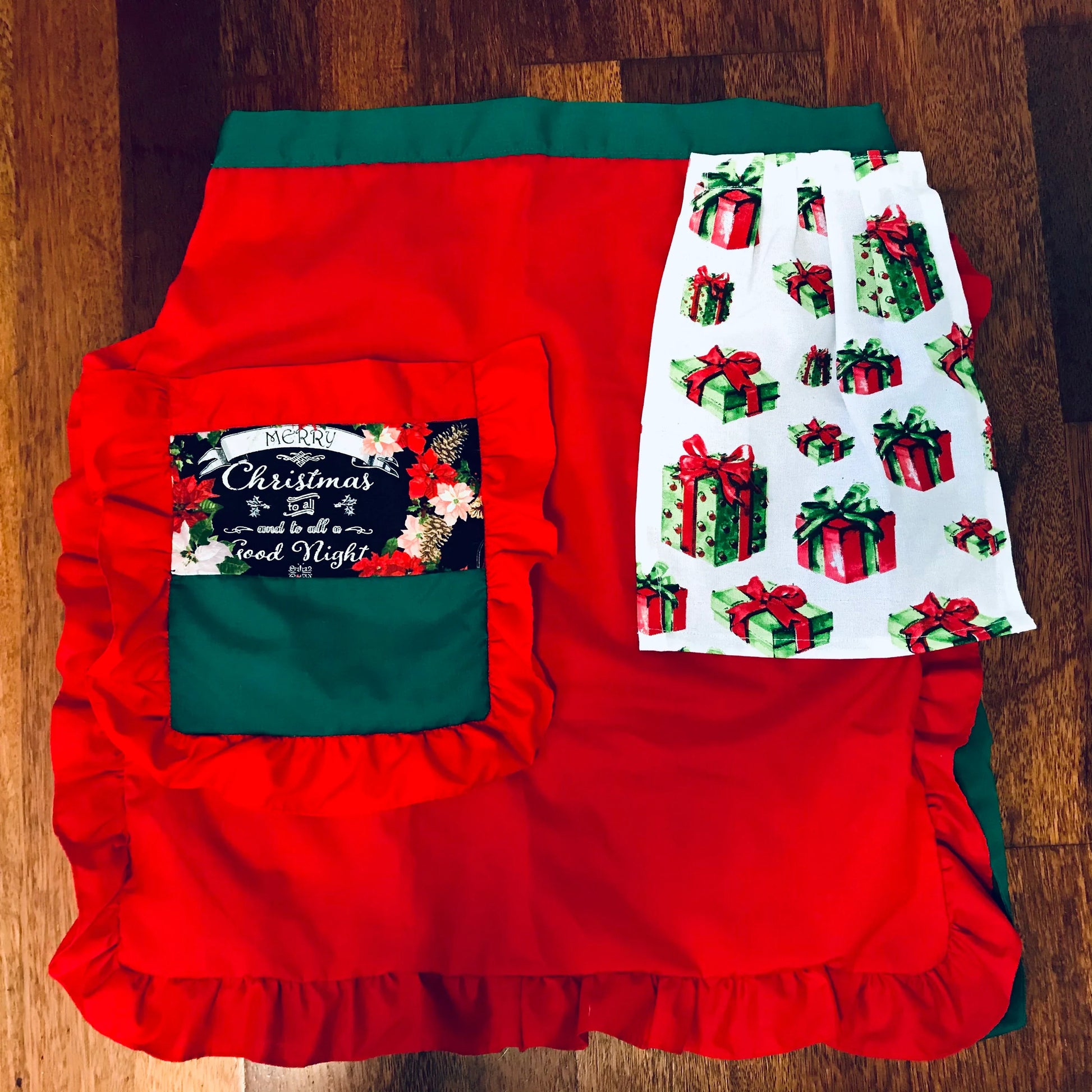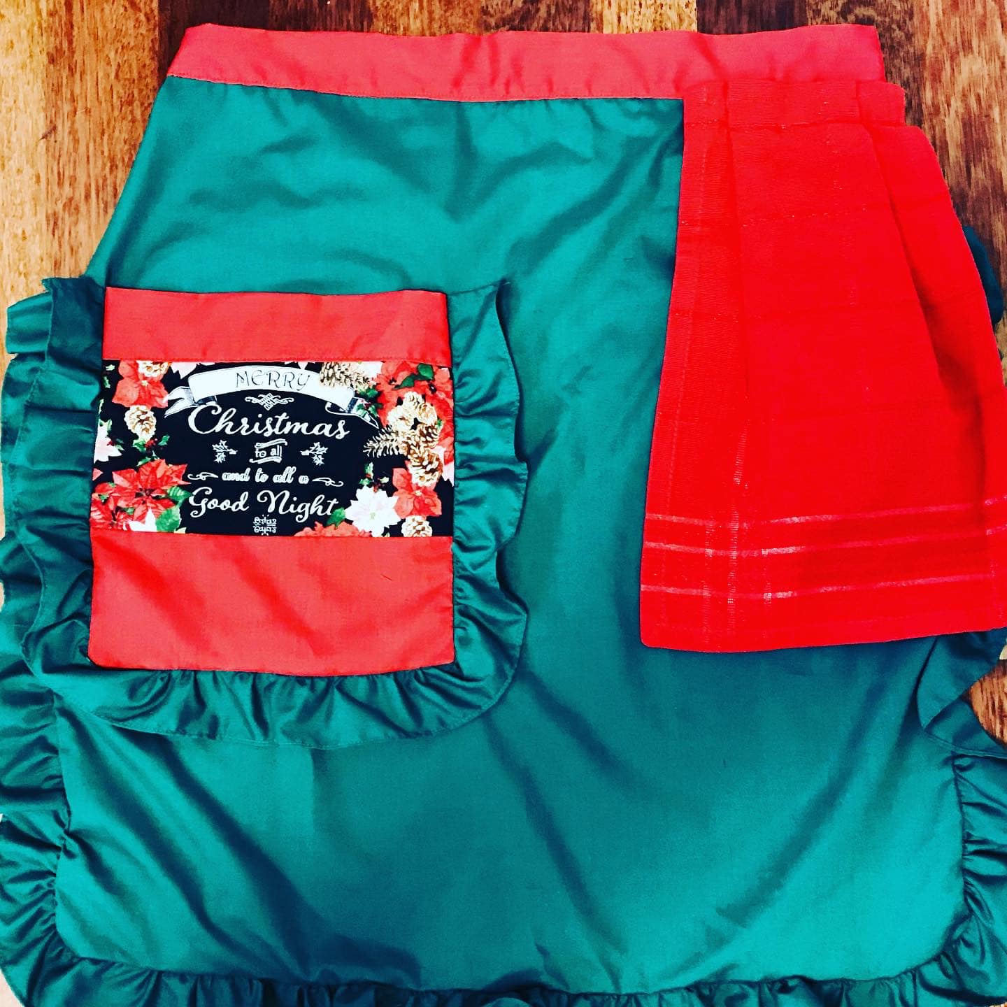 Christmas Waist Apron with Hand Towel and Pocket- Plain Green with "Poinsettia Pocket" and "Glittery Red" Hand Towel
