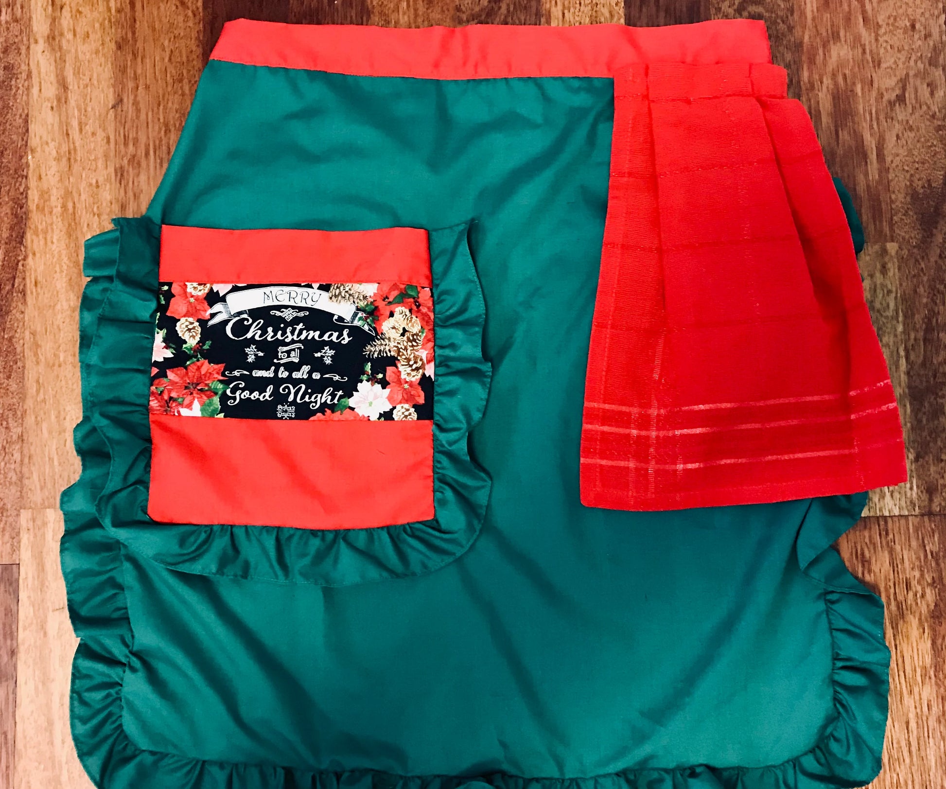 Christmas Apron with a removable hand towel and large pocket and removable hand towel.