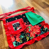 Christmas Apron with a removable hand towel and large pocket in a Poinsettia print with red frills and red waffle hand towel.