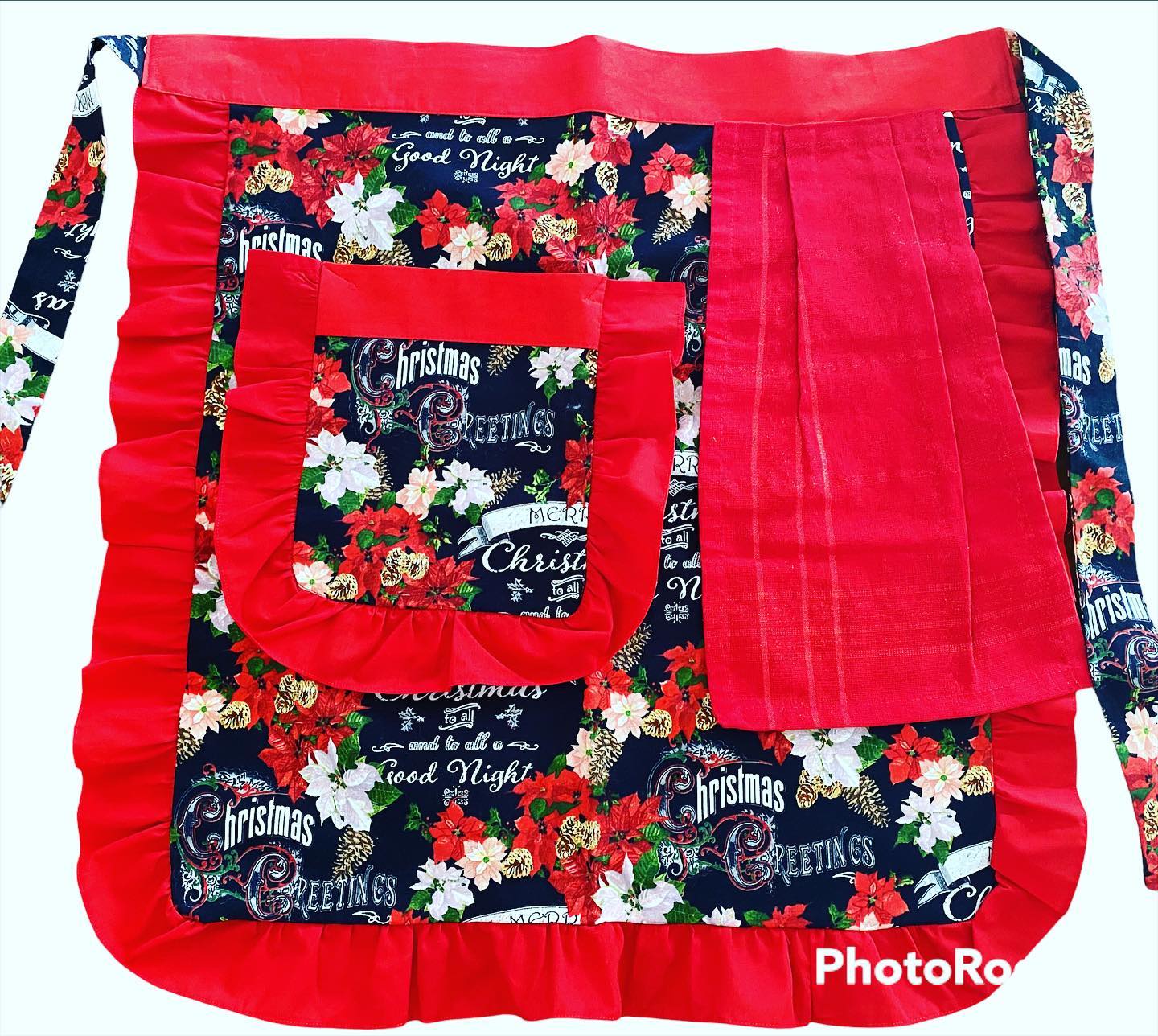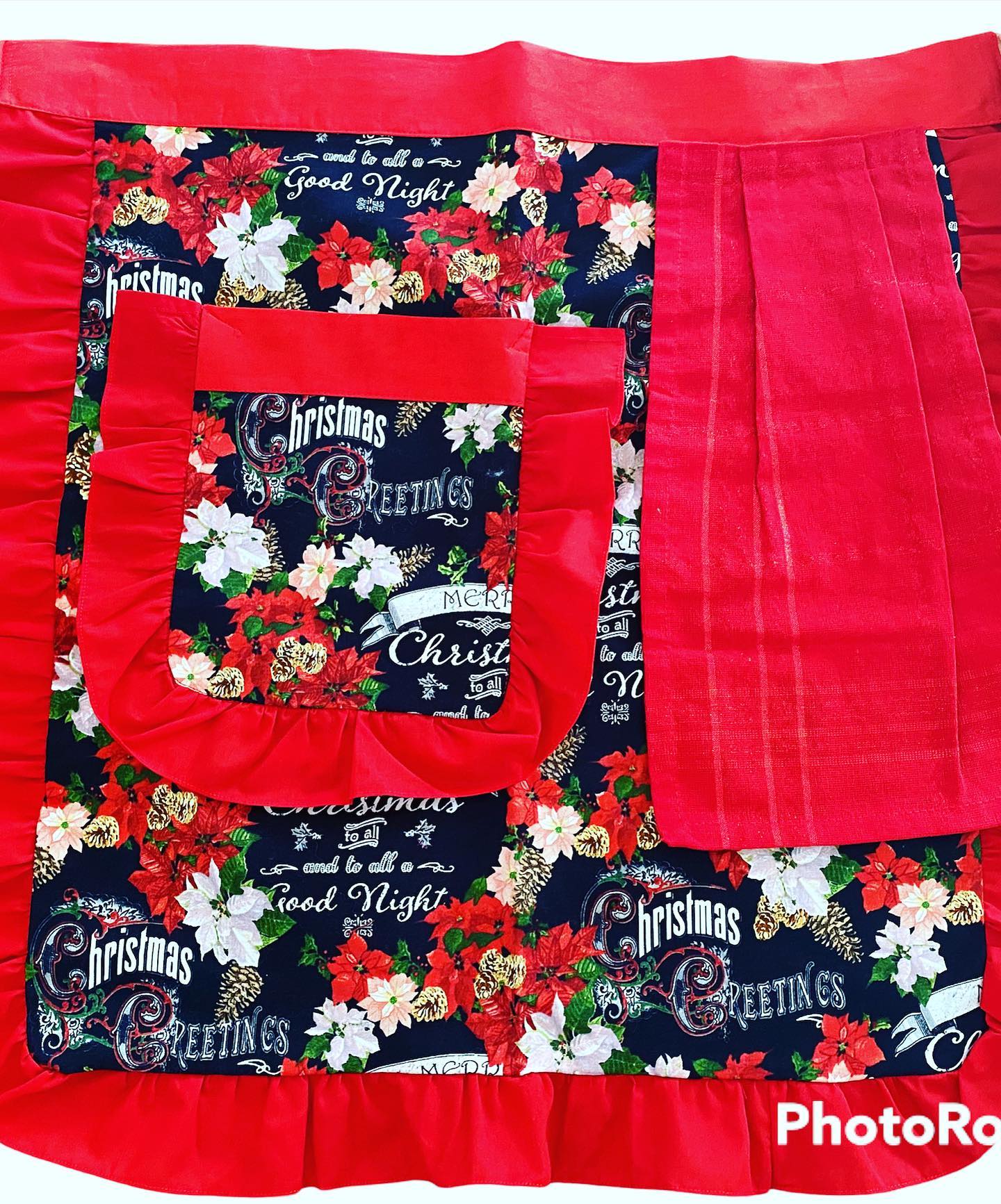 Christmas Waist Apron with Hand Towel and Pocket- "Pink and Red Poinsettias" Print