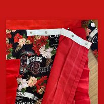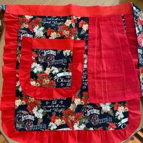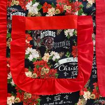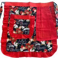 Christmas Apron with a removable hand towel and large pocket in a pink and red Poinsettia print with red frills and red glittery hand towel.