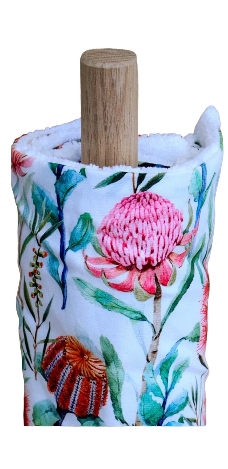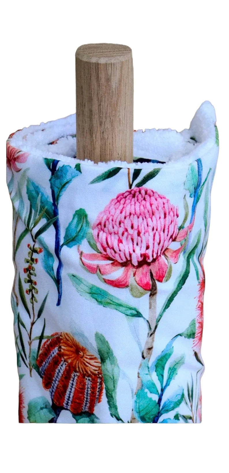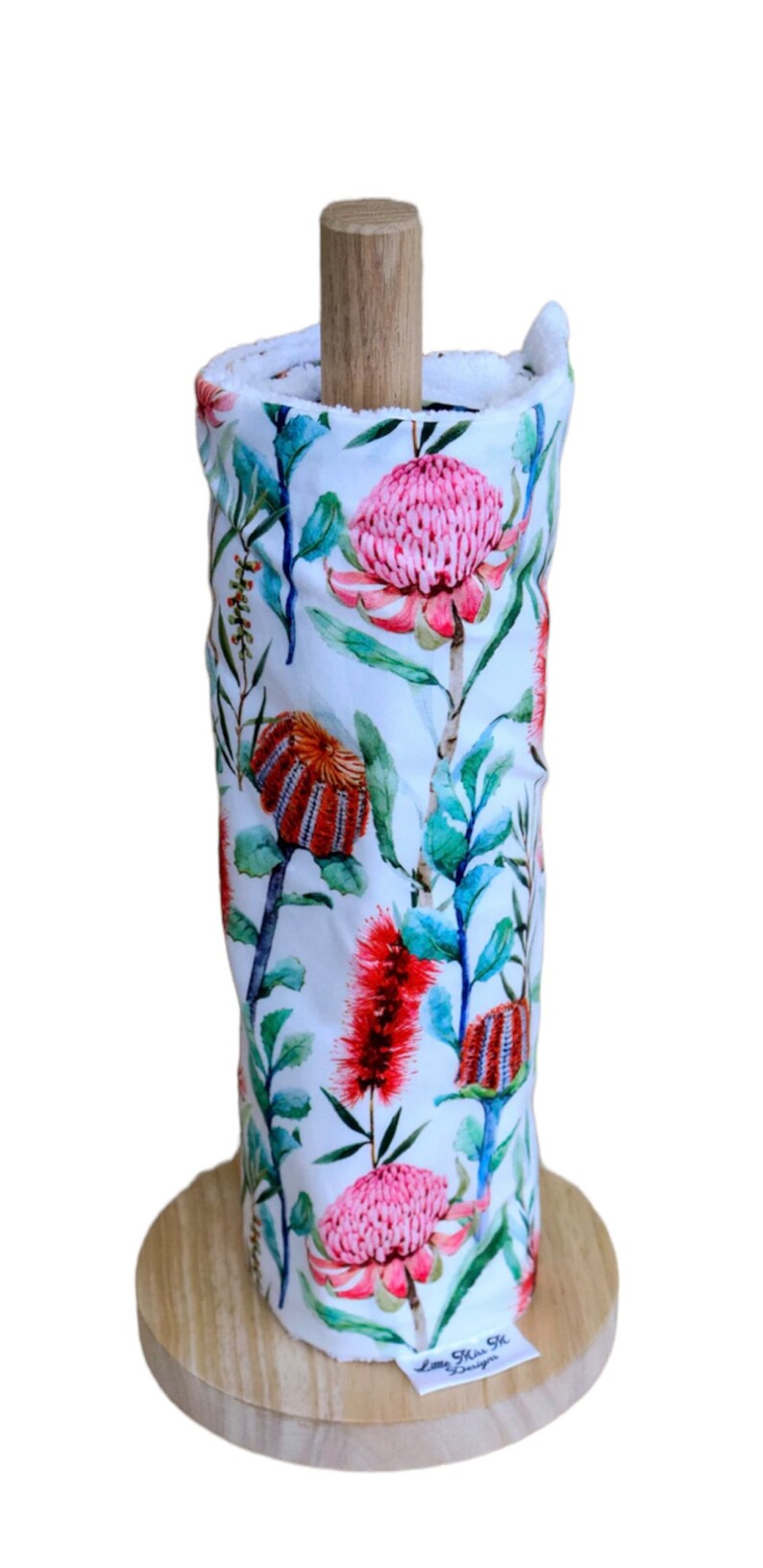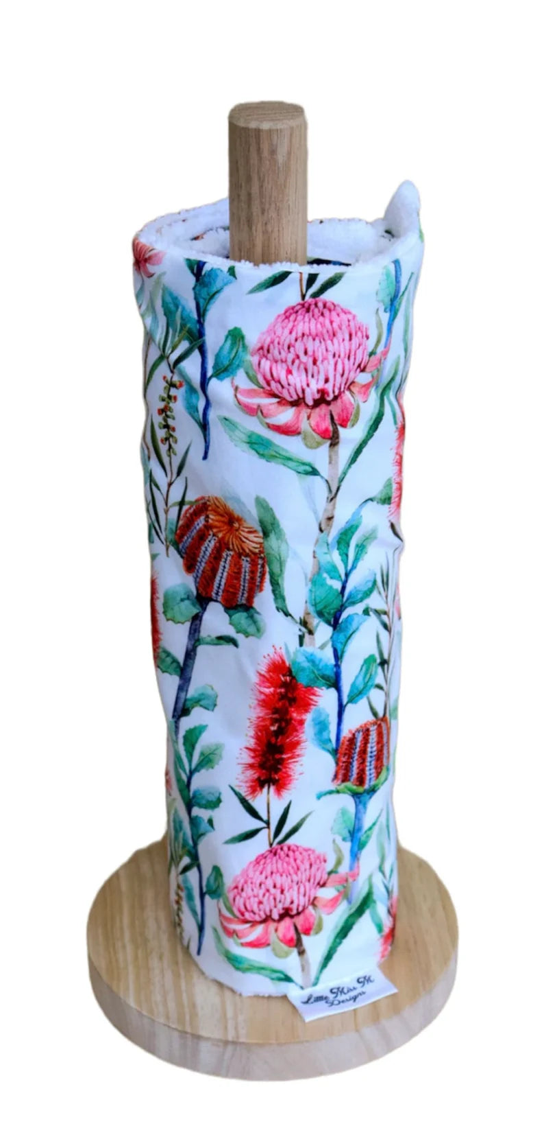 These beautiful Unpaper Towels are handmade in Australia. This one includes a carefully handmade wooden paper towel holder.